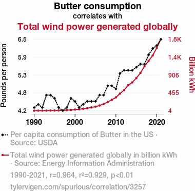 This means 92.9% of the change in the one variable (i.e., Total wind power generated globally) is predictable based on the change in the other (i.e., Butter consumption) over the 32 years from 1990 through 2021.