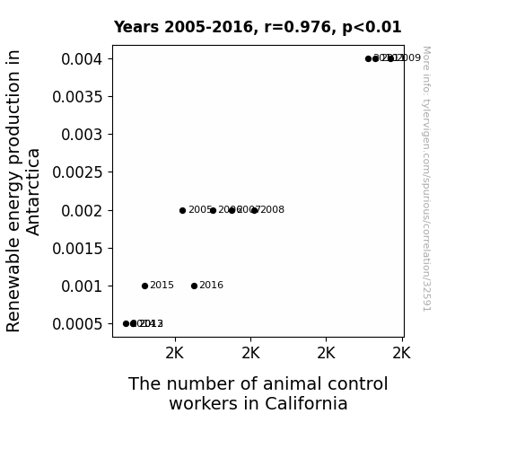 This means 95.3% of the change in the one variable (i.e., The number of animal control workers in California) is predictable based on the change in the other (i.e., Renewable energy production in Antarctica) over the 12 years from 2005 through 2016.