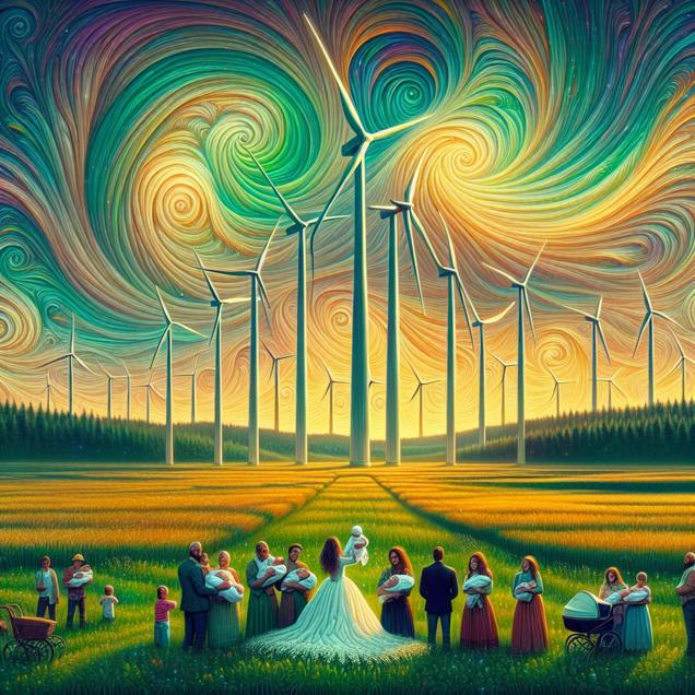 ChatGPT: In a picturesque field in Poland, wind turbines stand tall, their blades spinning gracefully. Above them, a soft, colorful glow emanates, creating swirling patterns in the sky. At the same time, parents across the country are choosing the name Aurora for their newborns, unknowingly and collectively conjuring the gentle but powerful winds that are now driving the turbines. The air is filled with the sound of the turbines whirring, and the name Aurora seems to permeate the very essence of the wind, becoming a part of the renewable energy landscape in a beautiful and unexpected way.