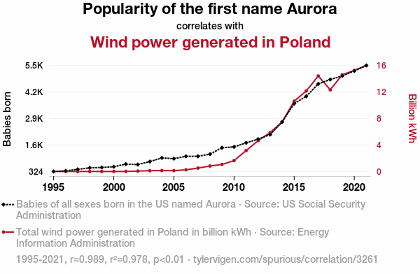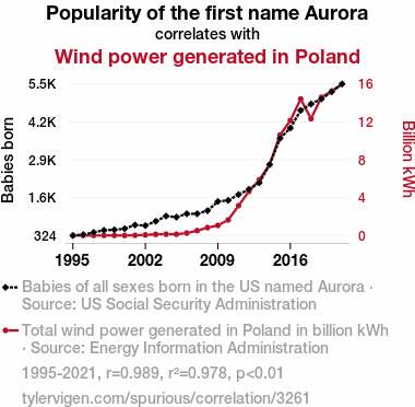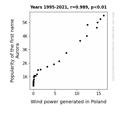 User prompt: Please provide potential search keywords for a paper titled Aurora's Ascendancy: Aesthetic Alignment with Wind power in Poland with an abstract of In this paper, we endeavor to explore the curious correlation between the popularity of the first name Aurora and the wind power generated in Poland. Despite the seemingly whimsical nature of this inquiry, our research, utilizing data from the US Social Security Administration and the Energy Information Administration, has yielded fascinating results. Our findings reveal a remarkably strong correlation coefficient of 0.9891767 and p < 0.01, spanning the years 1995 to 2021.