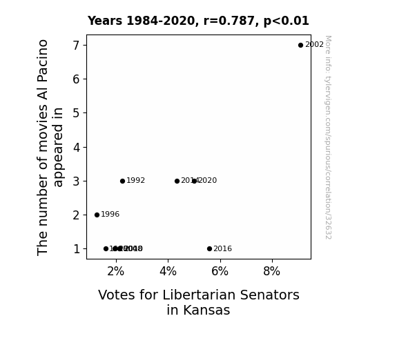 This means 62% of the change in the one variable (i.e., Votes for Libertarian Senators in Kansas) is predictable based on the change in the other (i.e., The number of movies Al Pacino appeared in) over the 10 years from 1984 through 2020.