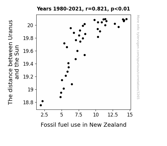 This means 67.4% of the change in the one variable (i.e., Fossil fuel use in New Zealand) is predictable based on the change in the other (i.e., The distance between Uranus and the Sun) over the 42 years from 1980 through 2021.