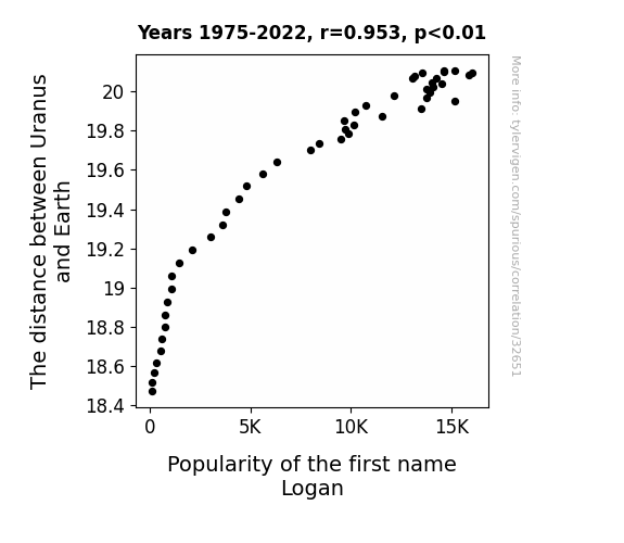 This means 90.8% of the change in the one variable (i.e., Popularity of the first name Logan) is predictable based on the change in the other (i.e., The distance between Uranus and Earth) over the 48 years from 1975 through 2022.