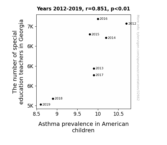 This means 72.4% of the change in the one variable (i.e., Asthma prevalence in American children) is predictable based on the change in the other (i.e., The number of special education teachers in Georgia) over the 8 years from 2012 through 2019.