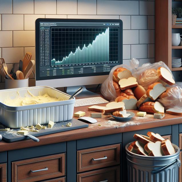 Prompt: [Photorealism] Generate an image of a cluttered kitchen counter, with a nearly empty butter dish prominently displayed. An overflowing garbage can nearby contains empty bread bags, indicating elevated toast consumption. In the background, incorporate a computer screen displaying Republic Services' stock price chart, highlighting a clear upward trend. Create a realistic and detailed scene capturing the essence of high butter and bread consumption, alongside the visual representation of the stock value trend. The depiction should include only scenes, people, and objects, it should not include text or speech bubbles.
