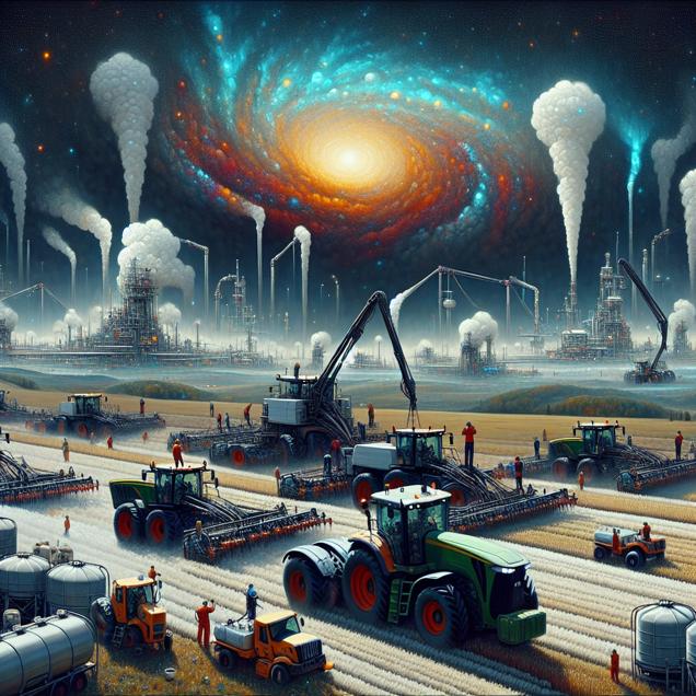 User prompt: Please respond with an image generation prompt that would be likely to create an interesting visual using DALLE-3, using the following style: [ An image that looks like it is a scene from 'Star Wars' ] and depicting this scene: In a visual scene, we see an increasing number of agricultural equipment operators in Pennsylvania, which leads to more "cropdust" emissions. This results in a rise in air pollution, represented by smoggy air. In response, we see the residents of Saint Pierre and Miquelon consuming more petroleum to power air purifiers, indicated by an increase in fuel usage and the operation of air purifying machines. Keep the visual depiction simple. Do not include any words or speech bubbles.