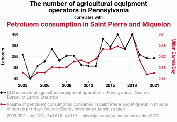 User prompt: Please make up a funny explanation for how increases in The number of agricultural equipment operators in Pennsylvania positively influenced Petroluem consumption in Saint Pierre and Miquelon.