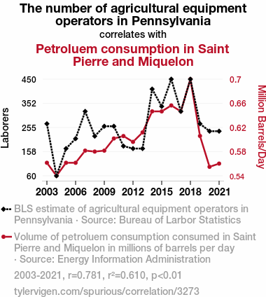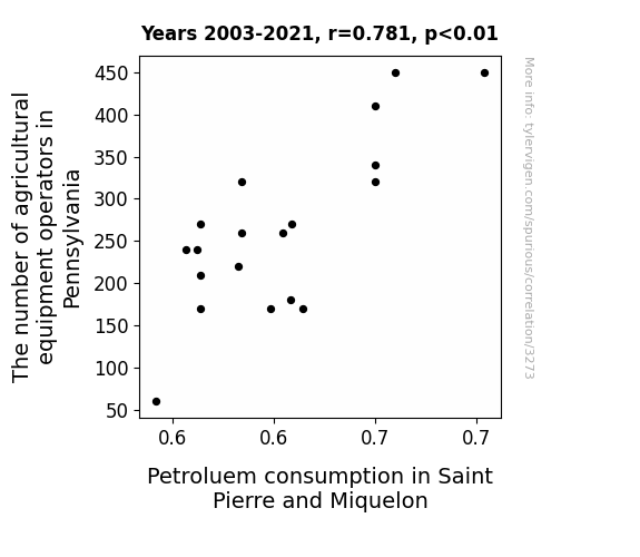 This means 61% of the change in the one variable (i.e., Petroluem consumption in Saint Pierre and Miquelon) is predictable based on the change in the other (i.e., The number of agricultural equipment operators in Pennsylvania) over the 19 years from 2003 through 2021.