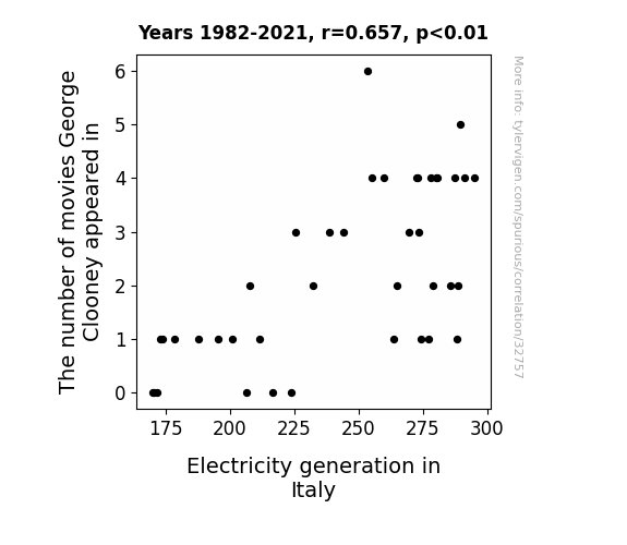 This means 43.1% of the change in the one variable (i.e., Electricity generation in Italy) is predictable based on the change in the other (i.e., The number of movies George Clooney appeared in) over the 40 years from 1982 through 2021.