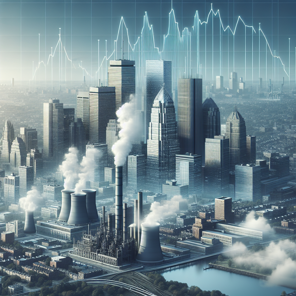 Prompt: [ A photo-realistic image ] Scene: In Boston, the sky clears revealing the city's iconic skyline. General Electric's products such as turbines and engines are visible, emitting heavy smog. A downward arrow on a financial chart symbolizes the drop in GE's stock price due to a decrease in demand for their goods. The depiction should include only scenes, people, and objects, it should not include text or speech bubbles.