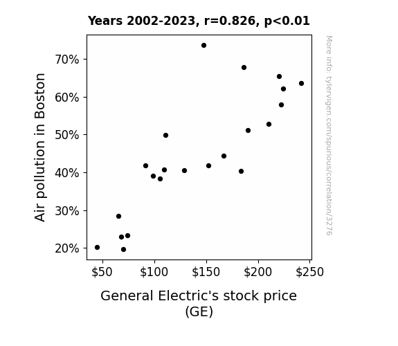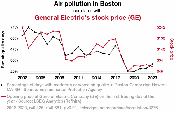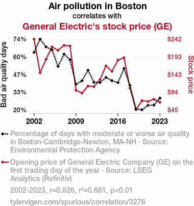 - The spurious research paper: Smoke and Mirrors: Uncovering the Relationship Between Air Pollution in Boston and General Electric's Stock Price
