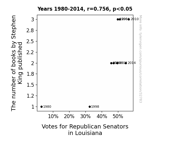 This means 57.1% of the change in the one variable (i.e., Votes for Republican Senators in Louisiana) is predictable based on the change in the other (i.e., The number of books by Stephen King published) over the 9 years from 1980 through 2014.