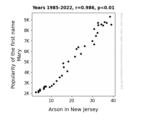 This means 97.3% of the change in the one variable (i.e., Arson in New Jersey) is predictable based on the change in the other (i.e., Popularity of the first name Mary) over the 38 years from 1985 through 2022.
