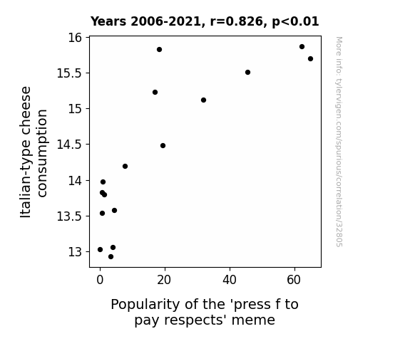 This means 68.2% of the change in the one variable (i.e., Popularity of the 'press f to pay respects' meme) is predictable based on the change in the other (i.e., Italian-type cheese consumption) over the 16 years from 2006 through 2021.