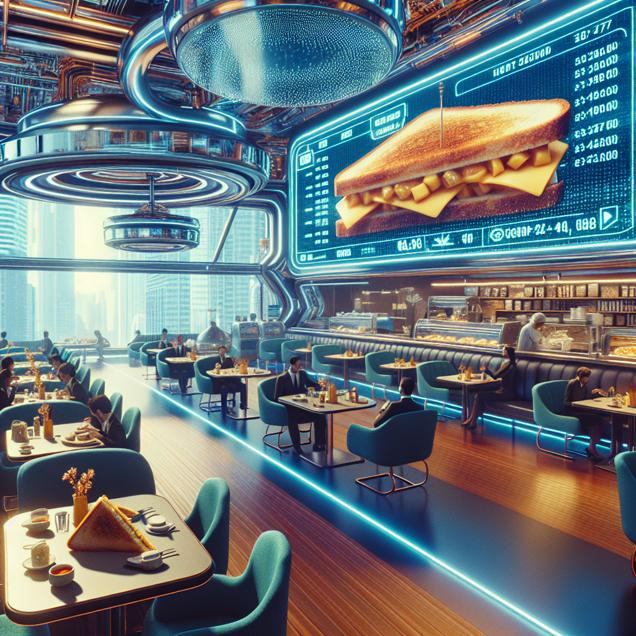 User prompt: Please respond with an image generation prompt that would be likely to create an interesting visual using DALLE-3, using the following style: [ High-tech ] and depicting this scene: A bustling diner with people enjoying grilled cheese sandwiches made with American cheese, while in the background, the stock market ticker shows Trane Technologies' (TT) stock price soaring. Keep the visual depiction simple. Do not include any words or speech bubbles.
