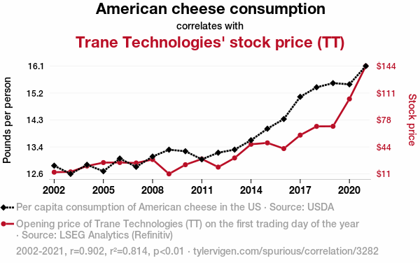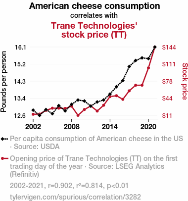 - The spurious research paper: Feta or Cheddar, TT Gets Better: The Whey to Wealth Connection Between American Cheese Consumption and Trane Technologies' Stock Price