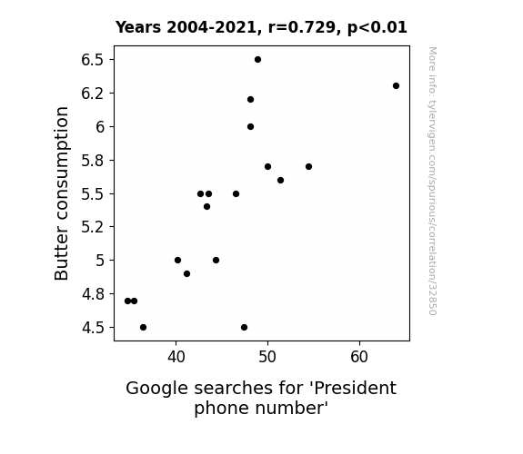 This means 53.2% of the change in the one variable (i.e., Google searches for 'President phone number') is predictable based on the change in the other (i.e., Butter consumption) over the 18 years from 2004 through 2021.
