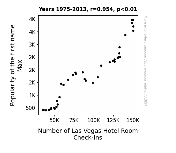 This means 90.9% of the change in the one variable (i.e., Number of Las Vegas Hotel Room Check-Ins) is predictable based on the change in the other (i.e., Popularity of the first name Max) over the 39 years from 1975 through 2013.
