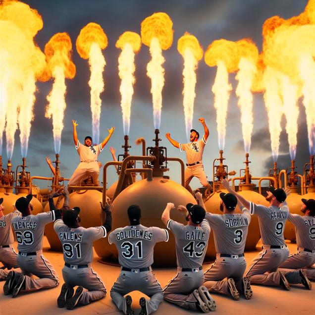 ChatGPT: In Central African Republic, a group of Chicago White Sox players are celebrating a big win. They are surrounded by LPG tanks, with flames rising and creating a warm, glowing ambiance. The players are beaming as they bask in the fiery aftermath of their explosive performance on the field, feeling energized and victorious.