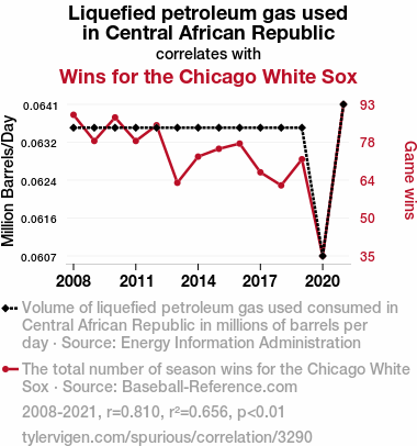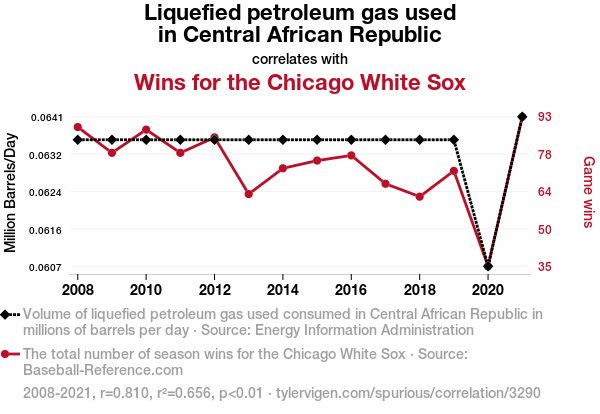 "Liquefied Petroleum Gas Central African Republic," "Chicago White Sox wins correlation," "Energy Information Administration data," "Baseball-Reference.com statistics," "Central African Republic LPG consumption," "Chicago White Sox winning streak," "Guaranteed Rate Field hotdogs," "International energy trends," "Baseball victories correlation," "Statistical correlation studies"