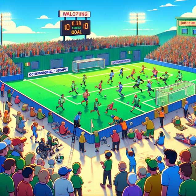 ChatGPT: In a soccer stadium, a scoreboard displays the Golden Boot Player's English Premier League goal tally increasing. Meanwhile, on the sidelines, a group of fans energetically reenact their favorite player's moves, but a few of them end up getting injured. In a nearby town in Iowa, a line of injured fans wait outside a clinic, where a sign reads "Occupational Therapy Assistants Needed".