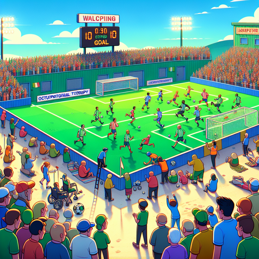 Prompt: [Scene for Cute 2D Animation] In a vibrant soccer stadium, the bright green pitch is filled with enthusiastic fans cheering for their team. A scoreboard with mesmerizing lights displays the Golden Boot Player's name, and each time their goal tally increases, the crowd erupts into cheers. On the sidelines, a group of animated fans attempts to reenact their favorite player's moves, resulting in comical and endearing mishaps. Some fans joyfully mimic their hero's skillful footwork, while others clumsily tumble, causing them to comically collide and fall. In a charming small town in Iowa, a line of adorable injured fans patiently wait outside a welcoming clinic. A friendly sign on the clinic door reads "Occupational Therapy Assistants Needed," adding a heartwarming touch to the scene. The depiction should include only scenes, people, and objects, it should not include text or speech bubbles.