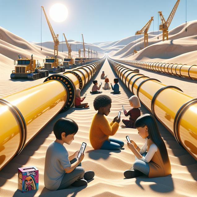 Prompt: Prompt: Generate a photo-realistic image of a Nevada desert landscape with a row of glossy yellow pipelayers stretching across the sandy terrain, surrounded by a group of excited children. The children are gathered around the pipelayers, busily using their smartphones to search for 'Bratz Dolls.' The desert sun beats down, casting long shadows as the children's fascination with the dolls combines with the industrial activity of the pipelayers. The depiction should include only scenes, people, and objects, it should not include text or speech bubbles.