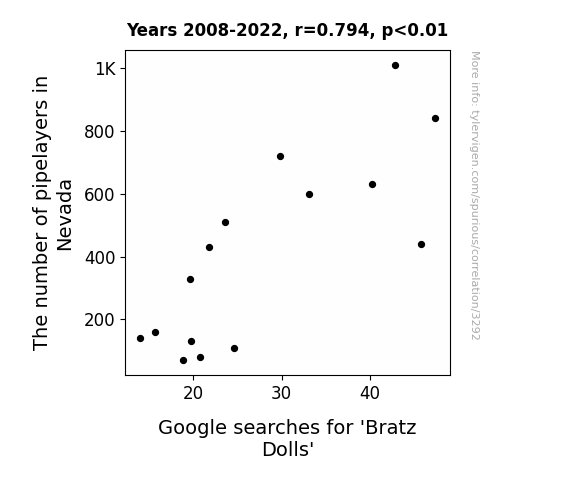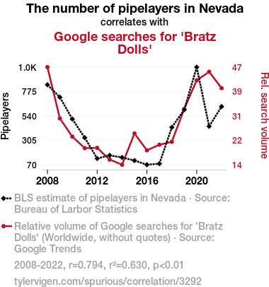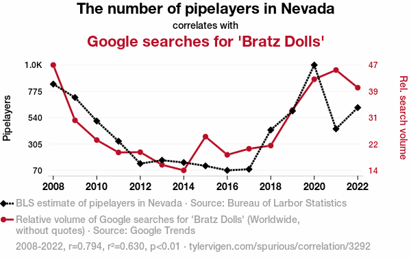 - The spurious research paper: The Laying of Pipes and the Purchasing of Dolls: An Analysis of the Relationship Between Pipelayers in Nevada and Google Searches for 'Bratz Dolls'