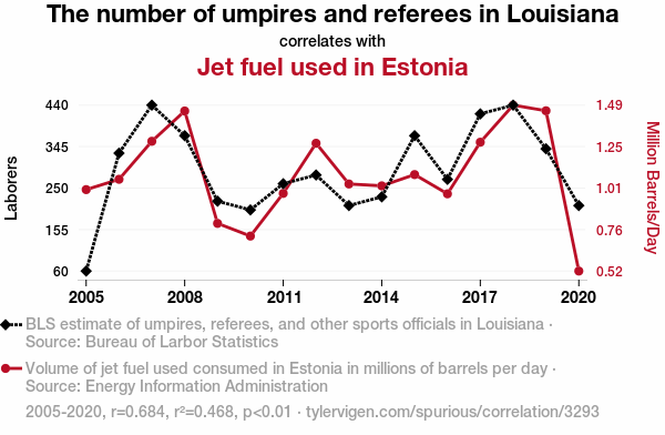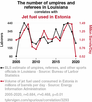 - The spurious research paper: Refereeing Reality: Unraveling the Peculiar Correlation Between Umpire Numbers in Louisiana and Jet Fuel Consumption in Estonia