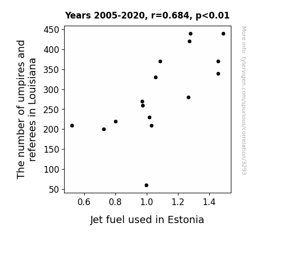 Figure 1 presents a scatterplot demonstrating the robust relationship between the number of umpires and referees in Louisiana and the consumption of jet fuel in Estonia over the period 2005 to 2020. The visualization starkly illustrates the surprisingly intertwined nature of these variables, leaving us with more questions than answers. As we contemplate this unexpected link, one cannot help but ponder whether the Louisiana umpires possess a hidden talent for jet fuel management – a real "home run" in the aviation industry, if you will.