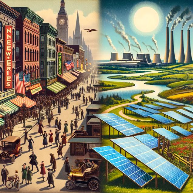 User prompt: Please respond with an image generation prompt that would be likely to create an interesting visual using DALLE-3, using the following style: [ A TIME magazine cover image ] and depicting this scene: A bustling street in the United States, with numerous breweries lining the sidewalk, each with a vibrant sign displaying the number of breweries in the country. People are gathered outside the breweries, engaging in conversations about fermentation and alternative energy. Across the Atlantic, in the United Kingdom, a sunny countryside landscape is dotted with solar panels glistening in the sunlight, indicating the increased solar power generated as a result of the inspiration from the American brewery surge. Keep the visual depiction simple. Do not include any words or speech bubbles.