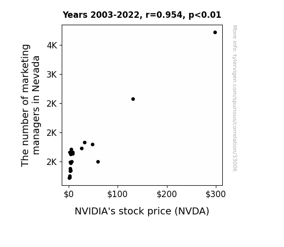 This means 91% of the change in the one variable (i.e., NVIDIA's stock price (NVDA)) is predictable based on the change in the other (i.e., The number of marketing managers in Nevada) over the 20 years from 2003 through 2022.