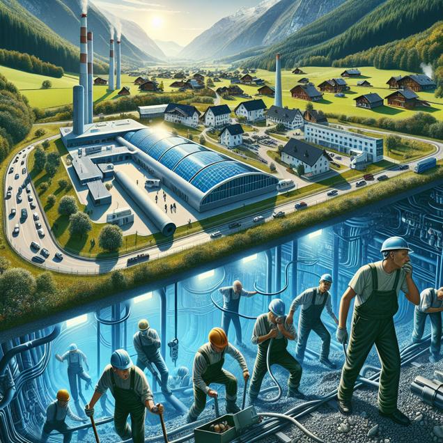 ChatGPT: Prompt: Generate an image depicting a high-tech geothermal power station in a picturesque Austrian village, surrounded by lush green countryside. Show a group of potential robbers shivering while attempting to dig a tunnel, but giving up due to the decrease in geothermal power generation, resulting in a decrease in robberies across the country. Ensure that the power station is futuristic and sleek amidst the natural beauty of the village. The potential robbers should appear frustrated and defeated, with the underground environment visibly becoming too cold. The contrast between the high-tech power station and the unsuccessful robberies should be visually striking.
