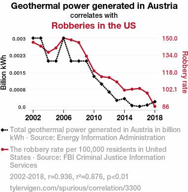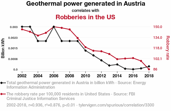 User prompt: Please provide potential search keywords for a paper titled Hot Spots and Hot Heists: Unearthing the Geothermal-Robbery Connection in Austria with an abstract of This paper investigates the intriguing relationship between geothermal power generation in Austria and incidences of robberies, presenting a correlation analysis from 2002 to 2018. Leveraging data from the Energy Information Administration and the FBI Criminal Justice Information Services, our findings reveal a robust correlation coefficient of 0.9358536 with statistical significance (p < 0.01), suggesting a compelling link between these seemingly disparate phenomena.