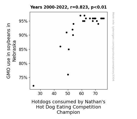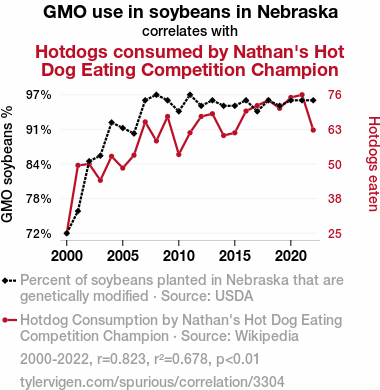 - The spurious research paper: The Wurst of Both Worlds: A Correlational Examination of GMO Soybeans in Nebraska and Nathan's Hot Dog Eating Contest Champions