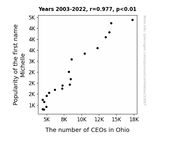 This means 95.4% of the change in the one variable (i.e., The number of CEOs in Ohio) is predictable based on the change in the other (i.e., Popularity of the first name Michelle) over the 20 years from 2003 through 2022.