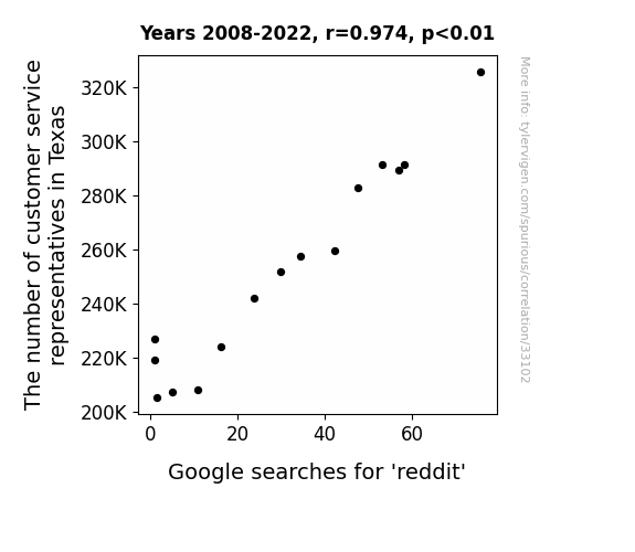 This means 94.9% of the change in the one variable (i.e., Google searches for 'reddit') is predictable based on the change in the other (i.e., The number of customer service representatives in Texas) over the 15 years from 2008 through 2022.