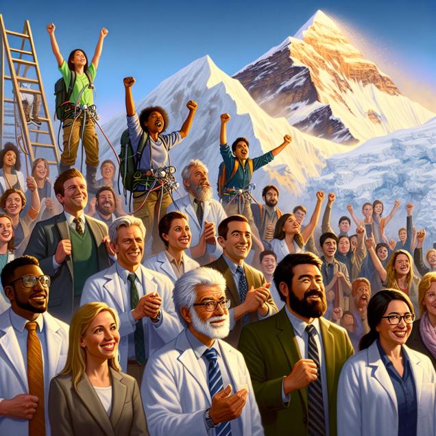ChatGPT: Generate an image of a group of university biological science teachers in Alabama joyfully presenting a groundbreaking discovery to their students. The scene transitions to the students climbing Mount Everest with confidence, reaching the summit and triumphantly raising their arms as the proud teachers watch from below, beaming with pride. The image should evoke a sense of joy, celebration, and achievement in a realistic style.