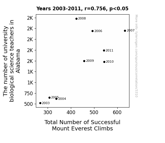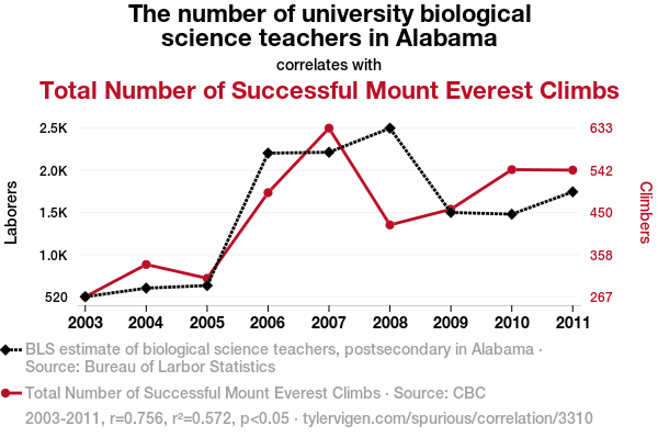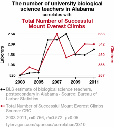 - The spurious research paper: The Summit of Science: Exploring the Relationship Between University Biological Science Teachers in Alabama and Total Number of Successful Mount Everest Climbs