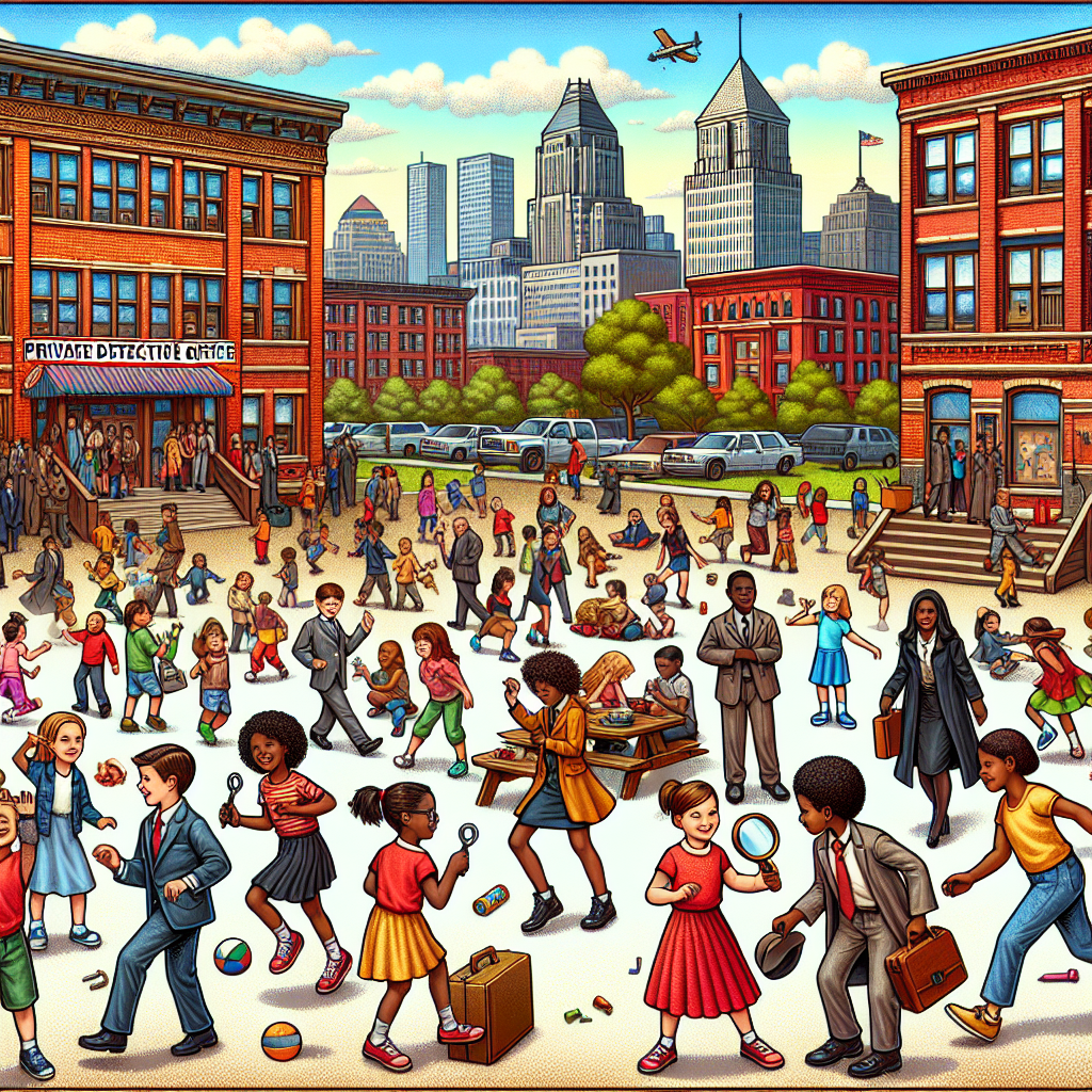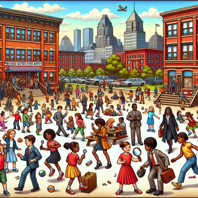 Prompt: [Whimsical illustration] Generate an image of a bustling Ohio city with a schoolyard in the foreground. In the schoolyard, children are shown playing, and the name "Mara" is referenced several times as kids run around. Some children are engaged in detective games, eagerly solving imaginary mysteries. In the background, a line of private detective offices can be seen, with a steady stream of young and determined Mara-named adults entering, ready to take on their next case. Capture the lively atmosphere and sense of adventure in the scene. The depiction should include only scenes, people, and objects, it should not include text or speech bubbles.