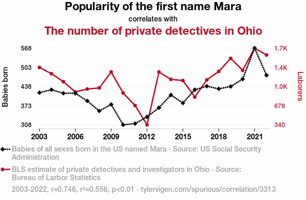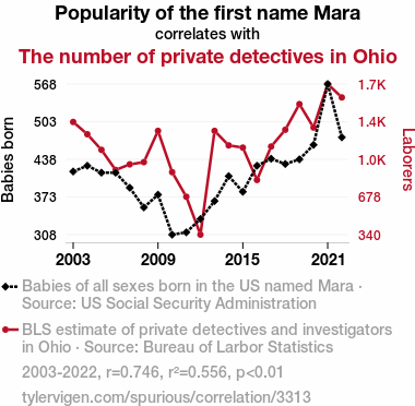 This means 55.6% of the change in the one variable (i.e., The number of private detectives in Ohio) is predictable based on the change in the other (i.e., Popularity of the first name Mara) over the 20 years from 2003 through 2022.