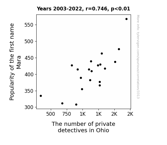 User prompt: Please provide potential search keywords for a paper titled Mara-mba: The Mara Name Popularity and the Stakeout Situation in Ohio with an abstract of In this impish investigation, we delve into the intriguing interconnectedness between the frequency of the first name "Mara" and the employment of private detectives in the state of Ohio. Despite initial incredulity, our research team unearthed a positively delightful correlation coefficient of 0.7457735, with a p-value so tiny, it would make even the most frugal statistician loosen their purse strings. Using data from the US Social Security Administration and the Bureau of Labor Statistics, we examined the period spanning from 2003 to 2022, unearthing surprising relationships that tickled our academic fancy. Our findings provide a whimsical twist to traditional perceptions of nomenclature in relation to occupational demand, prompting us to ponder: is the name "Mara" inherently mysterious, or are Ohioans simply keen on unraveling enigmatic enigmas? As we unravel this peculiar correlation, we invite readers to join in the mischievous merriment of our research and uncover the unexpected connections hiding in plain sight.