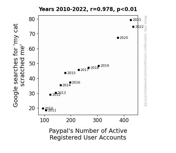 This means 95.6% of the change in the one variable (i.e., Paypal's Number of Active Registered User Accounts) is predictable based on the change in the other (i.e., Google searches for 'my cat scratched me') over the 13 years from 2010 through 2022.
