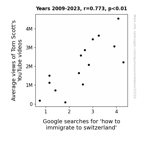 This means 59.7% of the change in the one variable (i.e., Google searches for 'how to immigrate to switzerland') is predictable based on the change in the other (i.e., Average views of Tom Scott's YouTube videos) over the 15 years from 2009 through 2023.