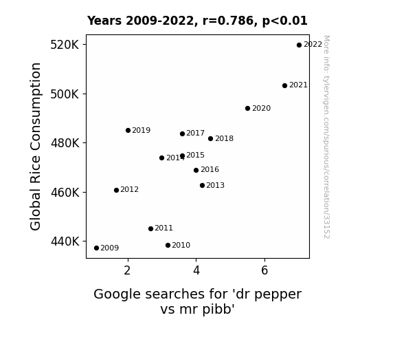 This means 61.8% of the change in the one variable (i.e., Google searches for 'dr pepper vs mr pibb') is predictable based on the change in the other (i.e., Global Rice Consumption) over the 14 years from 2009 through 2022.