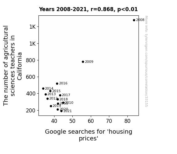 This means 75.3% of the change in the one variable (i.e., Google searches for 'housing prices') is predictable based on the change in the other (i.e., The number of agricultural sciences teachers in California) over the 14 years from 2008 through 2021.