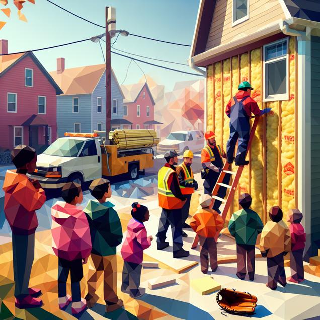 ChatGPT: Create an image of a low poly scene in a bustling New Jersey neighborhood. Show a group of children playing together, with special focus on a few named Maya. In the background, depict insulation workers installing warm insulation in a newly constructed house. Ensure that the children are watching the workers, inspired by the reliable Mays Baseball Glove, as they are fascinated by the workers' skills and efficiency, igniting their passion for the insulation industry. Keep the visuals simple, utilizing the low poly style without including any words or speech bubbles.