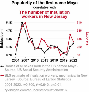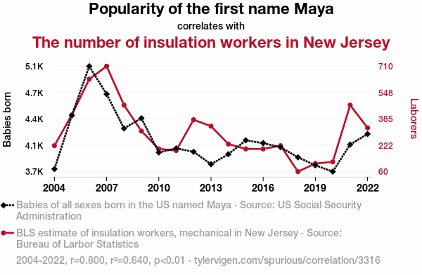 - The spurious research paper: Maya Tell: Investigating the Link Between the Popularity of the Name Maya and the Employment of Insulation Workers in New Jersey