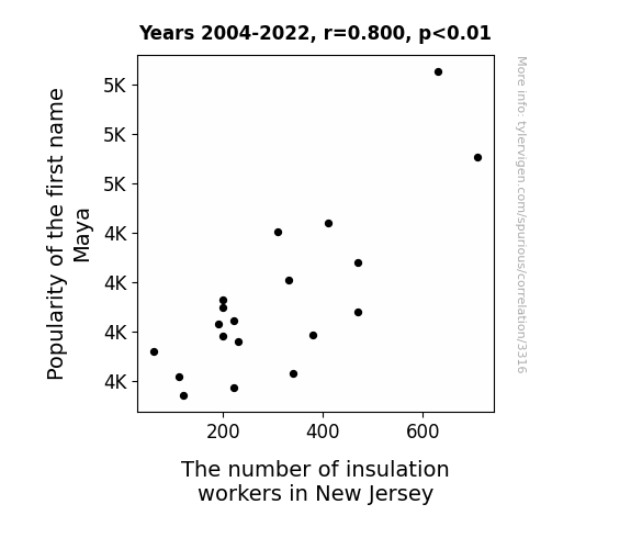 In our investigation of the connection between the popularity of the name "Maya" and the employment of insulation workers in New Jersey, we uncovered a remarkably strong correlation. From 2004 to 2022, the correlation coefficient between the prevalence of the name "Maya" and the number of insulation workers in New Jersey was found to be 0.8002806, indicating a robust positive relationship between these two variables. It's as if the name "Maya" had the power to keep things toasty, both in terms of human hearts and home insulation!