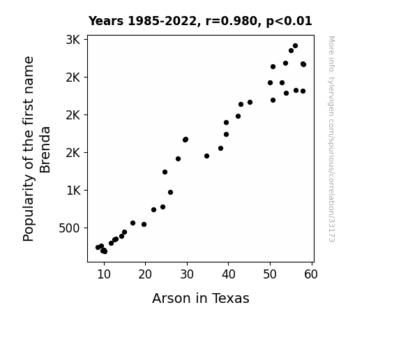 This means 96% of the change in the one variable (i.e., Arson in Texas) is predictable based on the change in the other (i.e., Popularity of the first name Brenda) over the 38 years from 1985 through 2022.